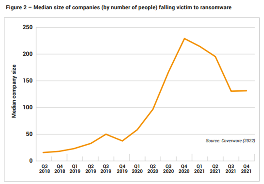 Recent evidence suggests that small businesses are increasingly at risk of falling victim to cyber crime. The Australian Cyber Security Centre found that, in 2021-2022, small businesses faced an average cost of $39,000 per cybercrime reported, and medium businesses faced an average cost of $88,000. Recent evidence points to a shift of cyber attacks being pointed towards mid-sized firms (see Figure 2) which are exposed as easier targets, and generally have lower risk of repercussions for the cyber criminals.